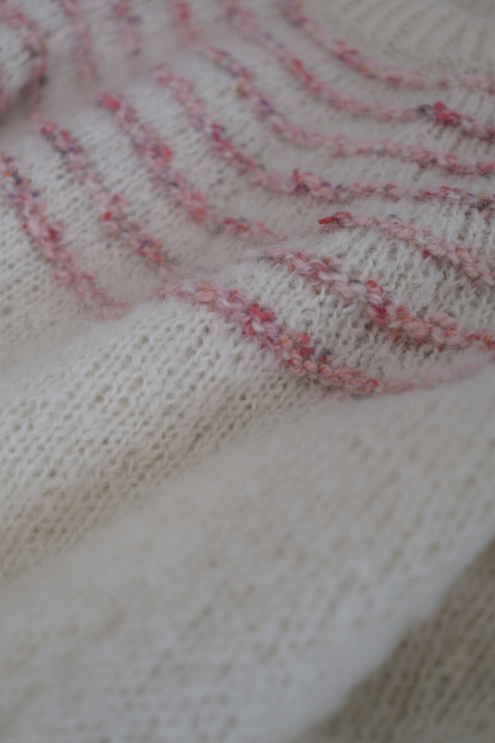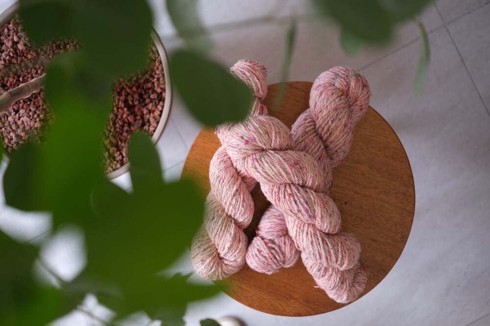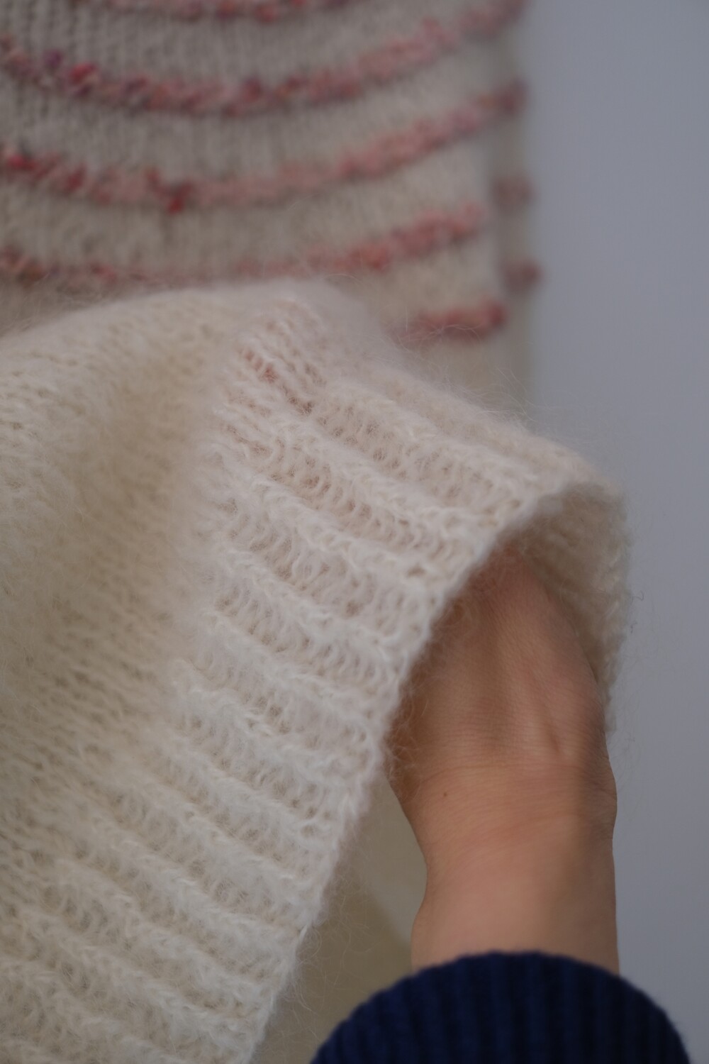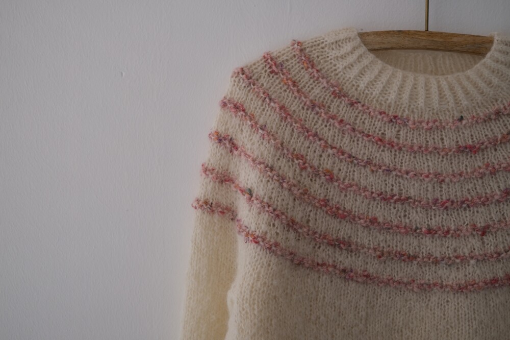 손으로 잣은 장밋빛 실은 마치 스피너의 손끝이 머물렀던 것처럼 요크 스웨터에 자연스럽게 남았어요.