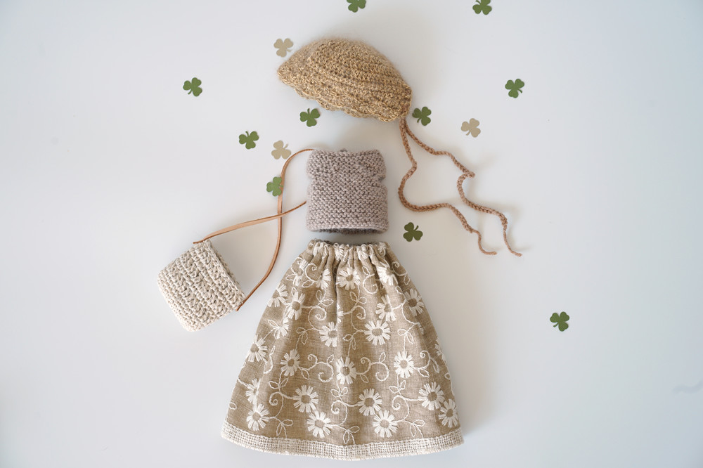 앙증맞은 머리에 보닛을 씌워 놓았더니 영락없는 막냇동생 느낌. 가을 동산에 올라 친구의 기타 연주에 맞춰 노래 부르던 소녀 데이지는 이렇게나 사랑스러웠겠죠! 데이지 러블리 보닛 세트는 알파카 베이지 니트, 꽃자수 밴딩 스커트, 은은한 금빛 펄감이 도는 보닛, 니트 가방으로 구성되어 있어요. 모든 의상과 액세서리는 탈부착이 가능합니다.