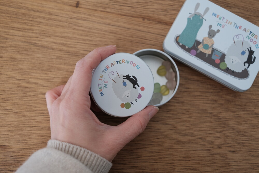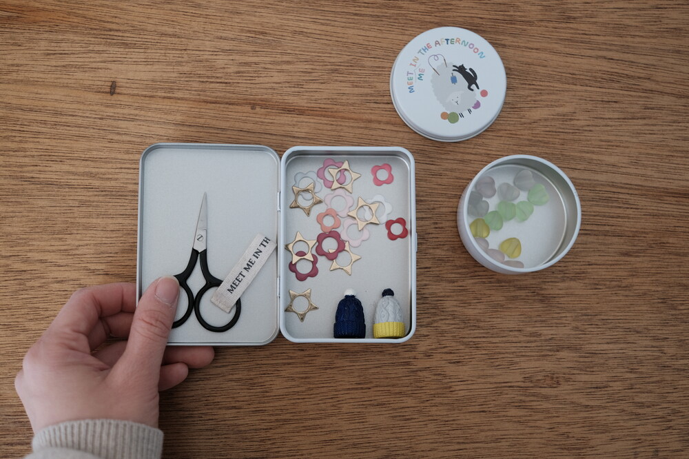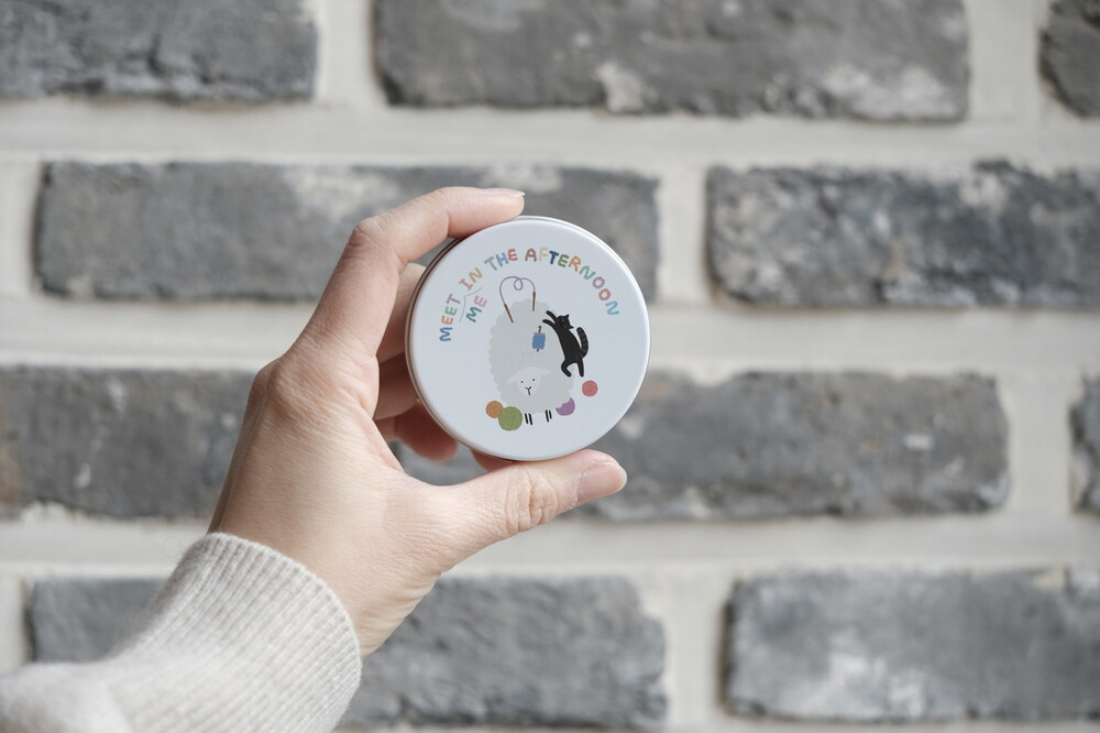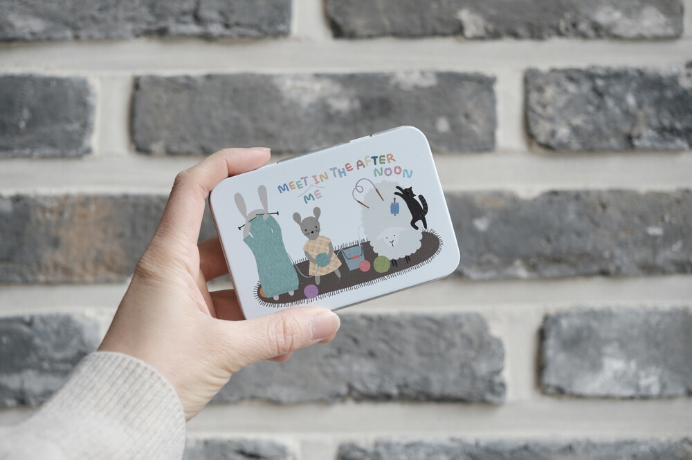 "루시 협동조합"이 인쇄된 틴케이스입니다. 뜨개나 자수 할 때 쓰는 마커, 가위, 핀, 꽈배기바늘과 바늘 마개 등 소품을 넣어 다니기 좋아요. 루시, 루나 그리고 볼트가 들려주는 따뜻한 슬로우루시 이야기가 담겨 있어서 작업하다가 힐끗 :)