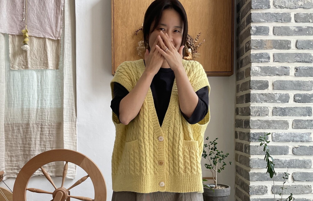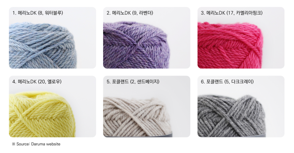 ※ 샘플는 손염색실로 떴으며, 키트 구성은 좀 더 가볍고 포근한 다루마 메리노 DK, 포클랜드 실로 준비했습니다.