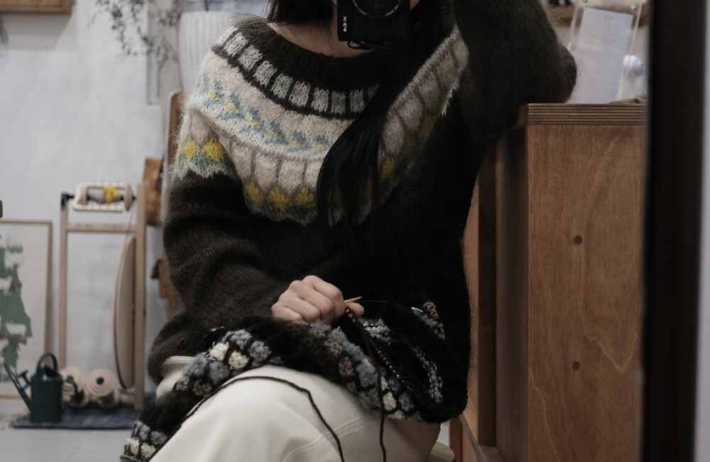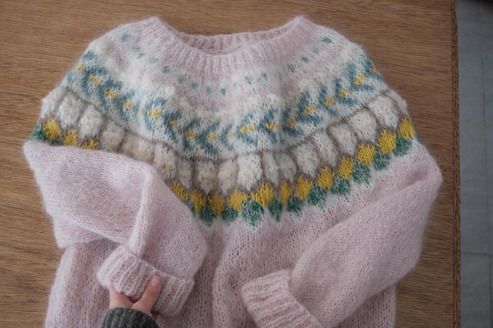바탕실인 울 모헤어의 부드러움과 숄을 두른 것 같은 배색 문의가 어우러진 사랑스러운 색감의 스웨터 입니다 :)